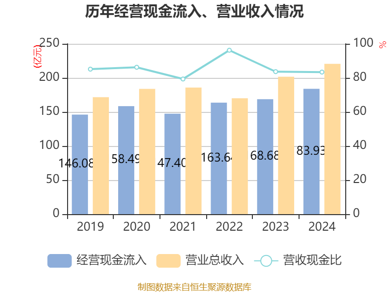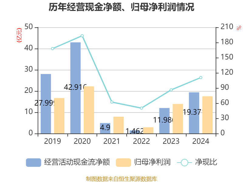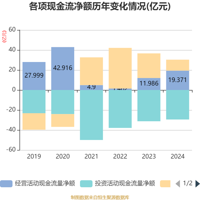截至2024年,公司经营活动现金流净额为19.37亿元,同比增长61.62%;筹资活动现金流净额10.96亿元,同比减少13.68亿元;投资活动现金流净额-29.49亿元,上年同期为-31.26亿元。