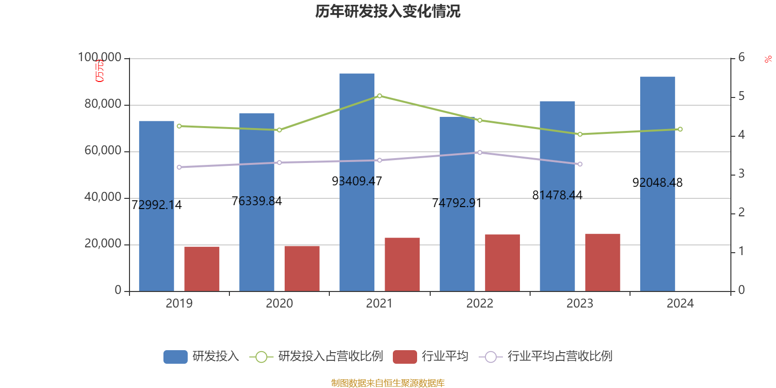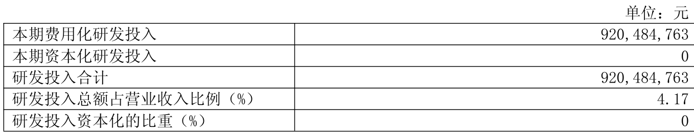 2024年全年,公司研发投入金额为9.2亿元,同比增长12.97%;研发投入占营业收入比例为4.17%,相比上年同期上升0.13个百分点。此外,公司全年研发投入资本化率为0%。