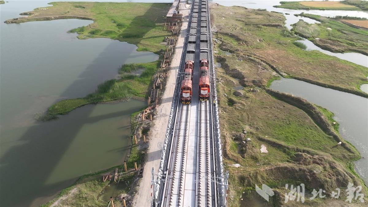 由中铁大桥局承建的襄荆高铁跨汉江主桥全长577.4米,是襄荆高铁全线控制性工程“一桥三隧”中的“一桥”。本次汉江主桥静载试验采用了22辆满载约880吨道砟的列车进行试验,由4台内燃机车头牵引驶入汉江主桥。