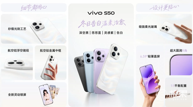 首先是vivo S50,这是一款很全能的标准版,采用轻薄设计,厚度仅7.49mm,搭配航空铝金属中框和圆润R角设计,握持感出色,提供告白、悠悠蓝、灵感紫、深空黑四款配色。