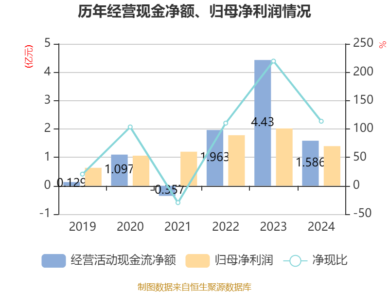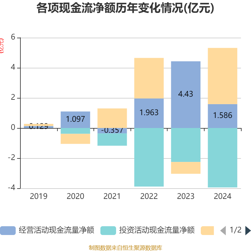 截至2024年,公司经营活动现金流净额为1.59亿元,同比下降64.21%;筹资活动现金流净额3.73亿元,同比增加4.52亿元;投资活动现金流净额-3.95亿元,上年同期为-2.25亿元。