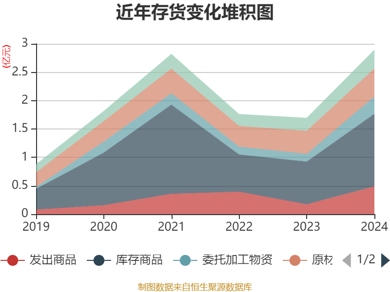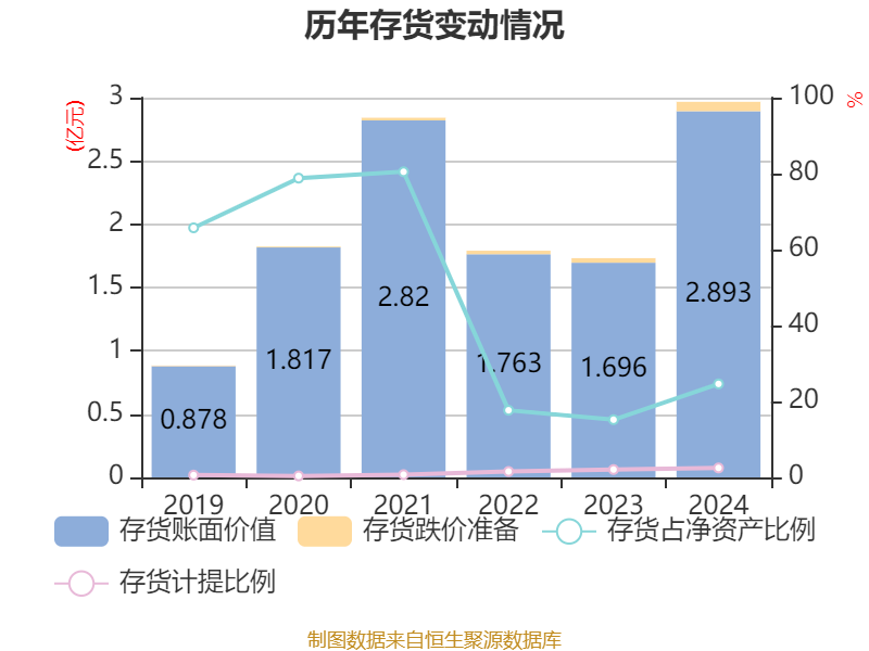 从存货变动来看,截至2024年末,公司存货账面价值为2.89亿元,占净资产的24.62%,较上年末增加1.2亿元。其中,存货跌价准备为737.9万元,计提比例为2.49%。