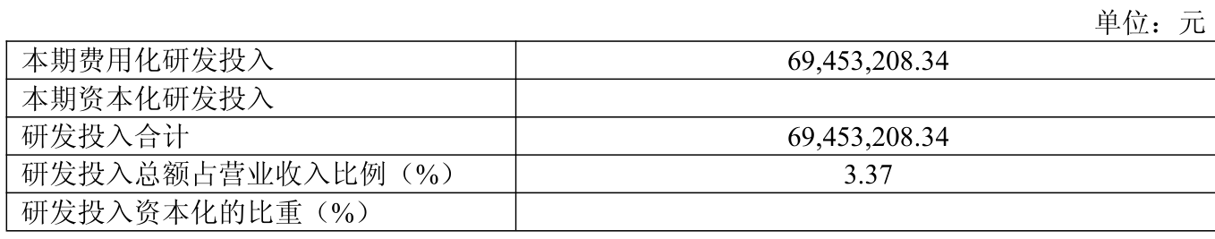 2024年全年,公司研发投入金额为6945.32万元,同比增长7.01%;研发投入占营业收入比例为3.37%,相比上年同期下降0.79个百分点。此外,公司全年研发投入资本化率为0%。