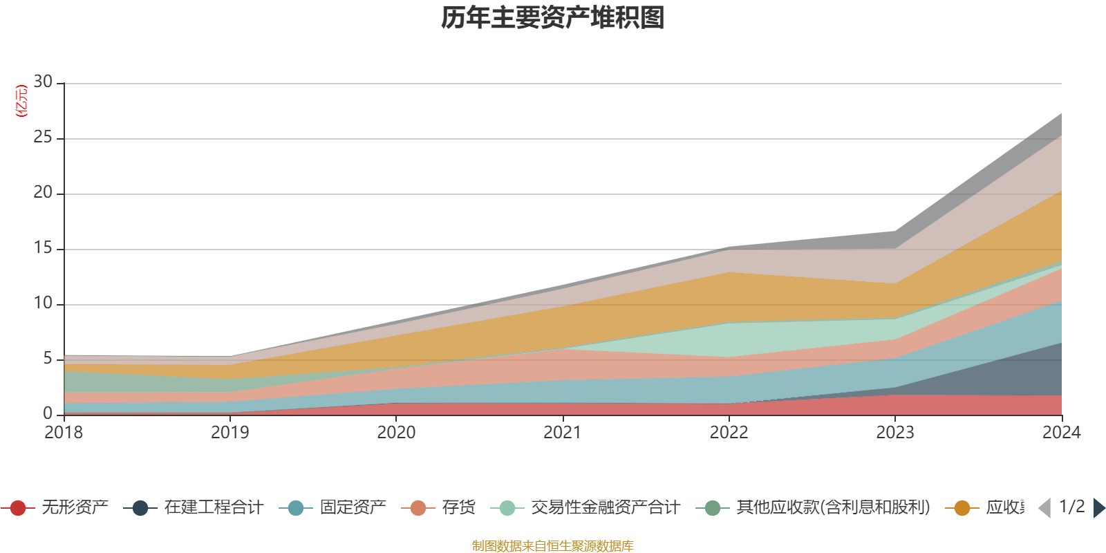 资产重大变化方面,截至2024年末,公司在建工程合计较上年末增加606.55%,占公司总资产比重上升13.44个百分点;交易性金融资产合计较上年末减少83.26%,占公司总资产比重下降9.76个百分点;应收票据及应收账款较上年末增加107.8%,占公司总资产比重上升4.89个百分点;无形资产较上年末减少3.41%,占公司总资产比重下降4.45个百分点。